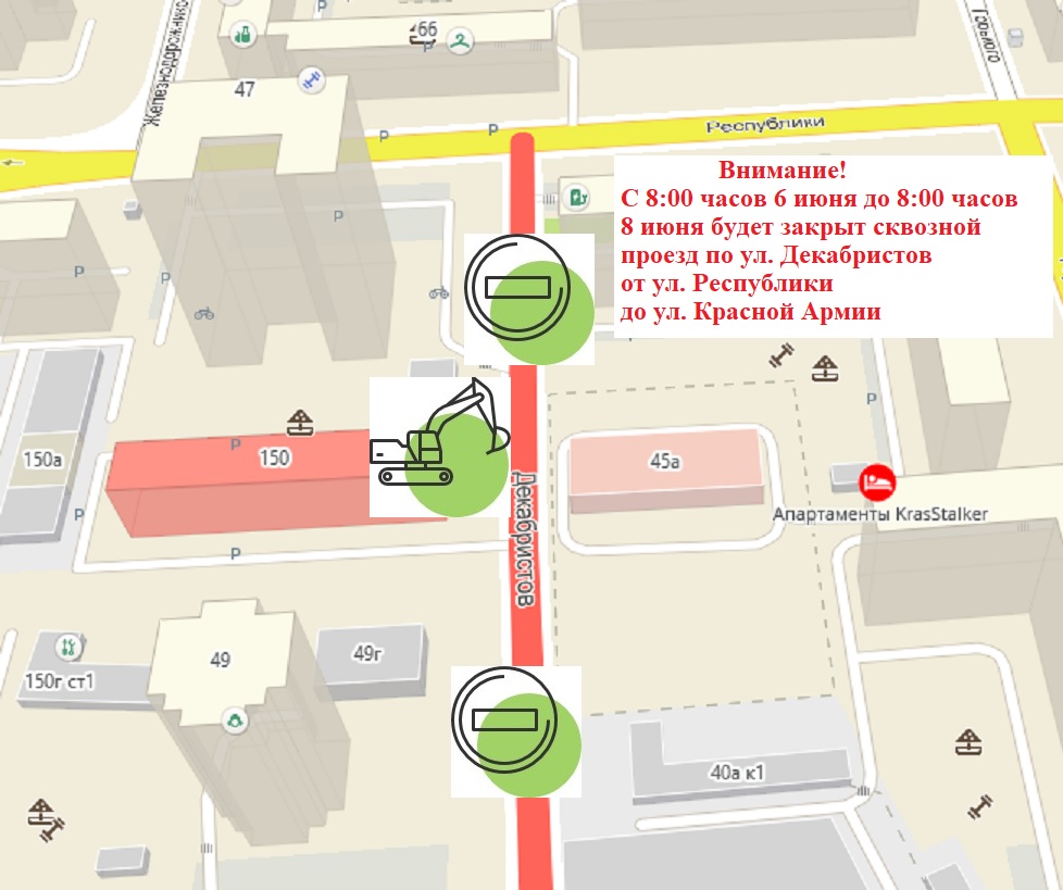 ❗️Вниманию водителей! Для ремонта аварийного канализационного колодца, расположенного по центру проезжей части на ул. Декабристов, 45-а, с 8:00 часов 6 июня до 8:00 часов 8 июня будет перекрыто сквозное движение транспорта на этом участке дороги.