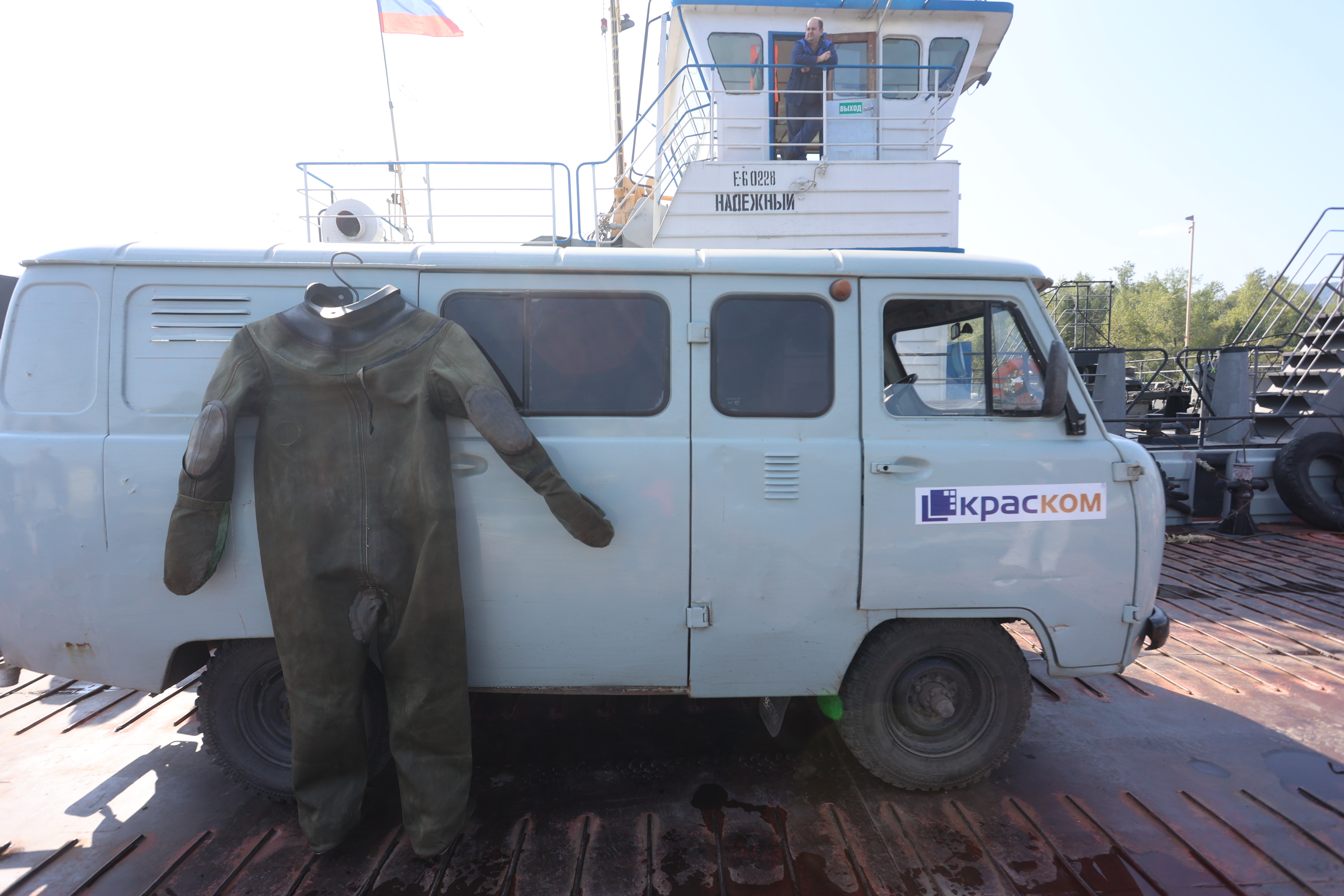 К месту на Енисее, под которым проходят трубопроводы, водолазов доставляет теплоход «Надёжный» собственной малой флотилии водоканала.Проводить исследования дежурный подводник отправляется обязательно с профессиональной «свитой»: напарником, который в непредвиденных обстоятельствах способен его заменить, водолазным фельдшером, следящим за его самочувствием, и техническими специалистами, контролирующими весь процесс погружения.