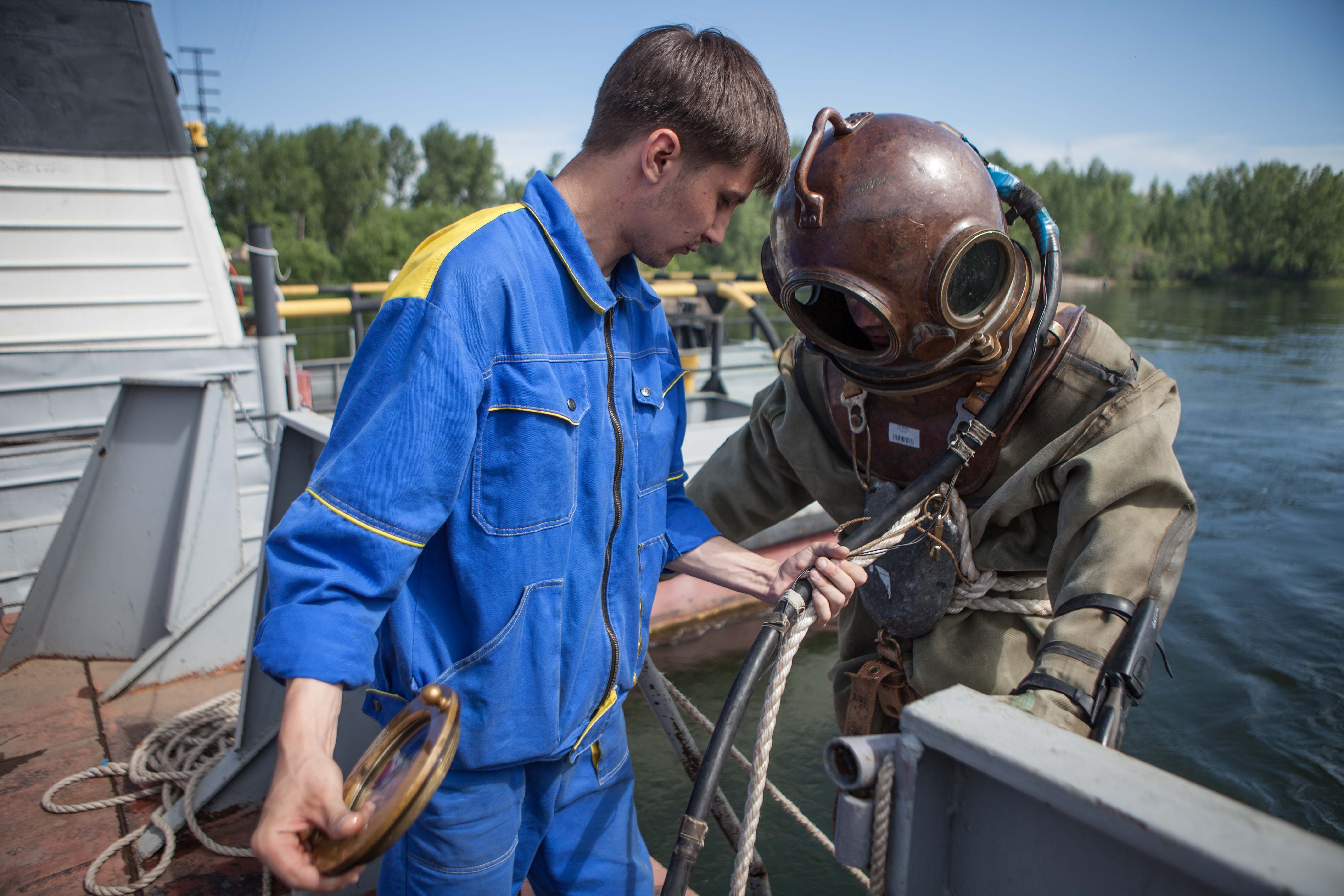 У водолазов есть лёгкое и тяжёлое снаряжение. При погружении в протоках Ладейской и Удачной выбирают второй вариант. Один шлем весит 16 кг, а в целом водолазные «доспехи», включая боты и вентилируемый скафандр, тянут на 85 кг. На суше такой груз носить тяжело, а вода делает его легче в разы.