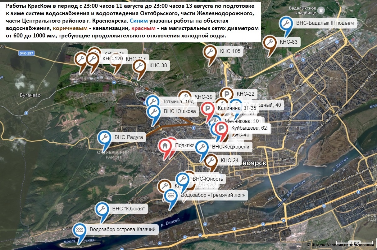 КрасКом приносит жителям этих районов извинения за временные неудобства и просит сделать необходимый запас питьевой воды.
