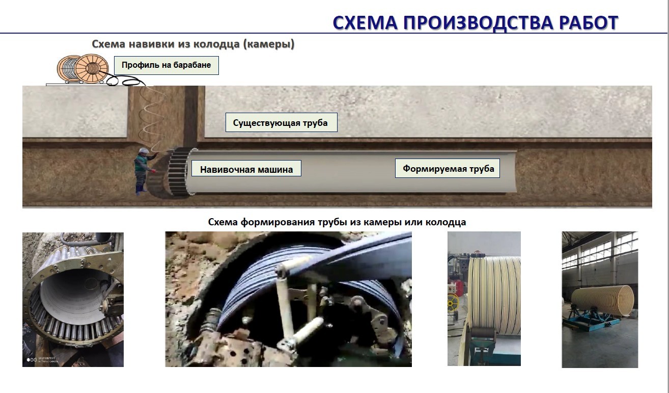 Это процесс формирования новой полимерной трубы с высокой кольцевой жесткостью и герметичностью внутри действующего коллектора посредством непрерывной навивки полимерного профиля по спирали с помощью навивочной машины. Пространство между старым и новым трубопроводами заполняется специальным полимерным бетоном, который обладает высокими гидроизоляционными характеристиками и прочностью.