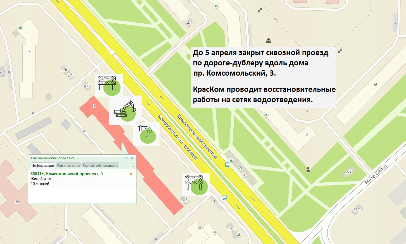 До пятницы, 5 апреля будет перекрыто сквозное движение по проезду-дублеру в районе жилого дома пр. Комсомольский, 3.