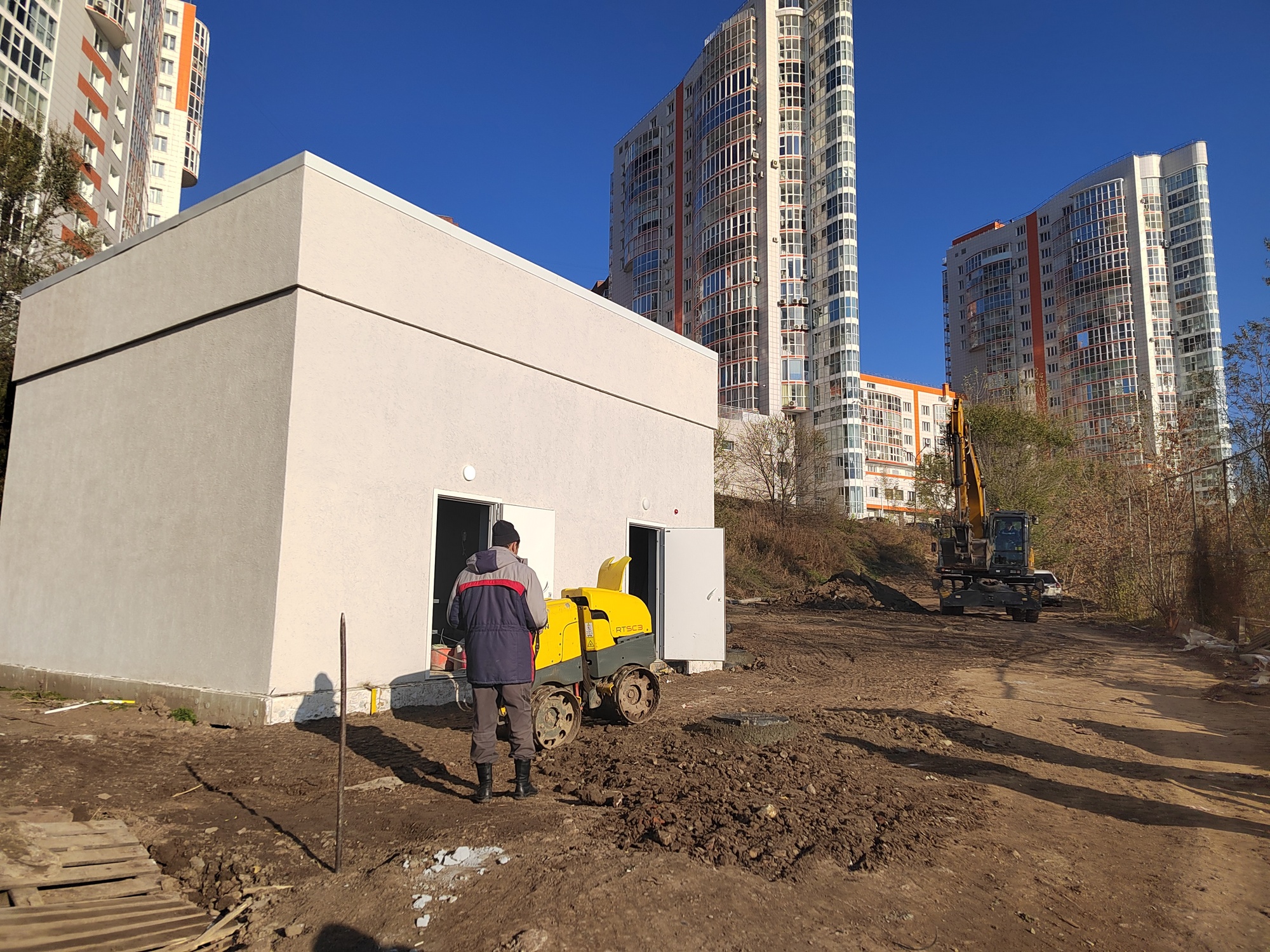 Сейчас вокруг здания КНС подрядчик строит отмостку и выполняет благоустройство, а в машинном зале завершает отделочные работы.