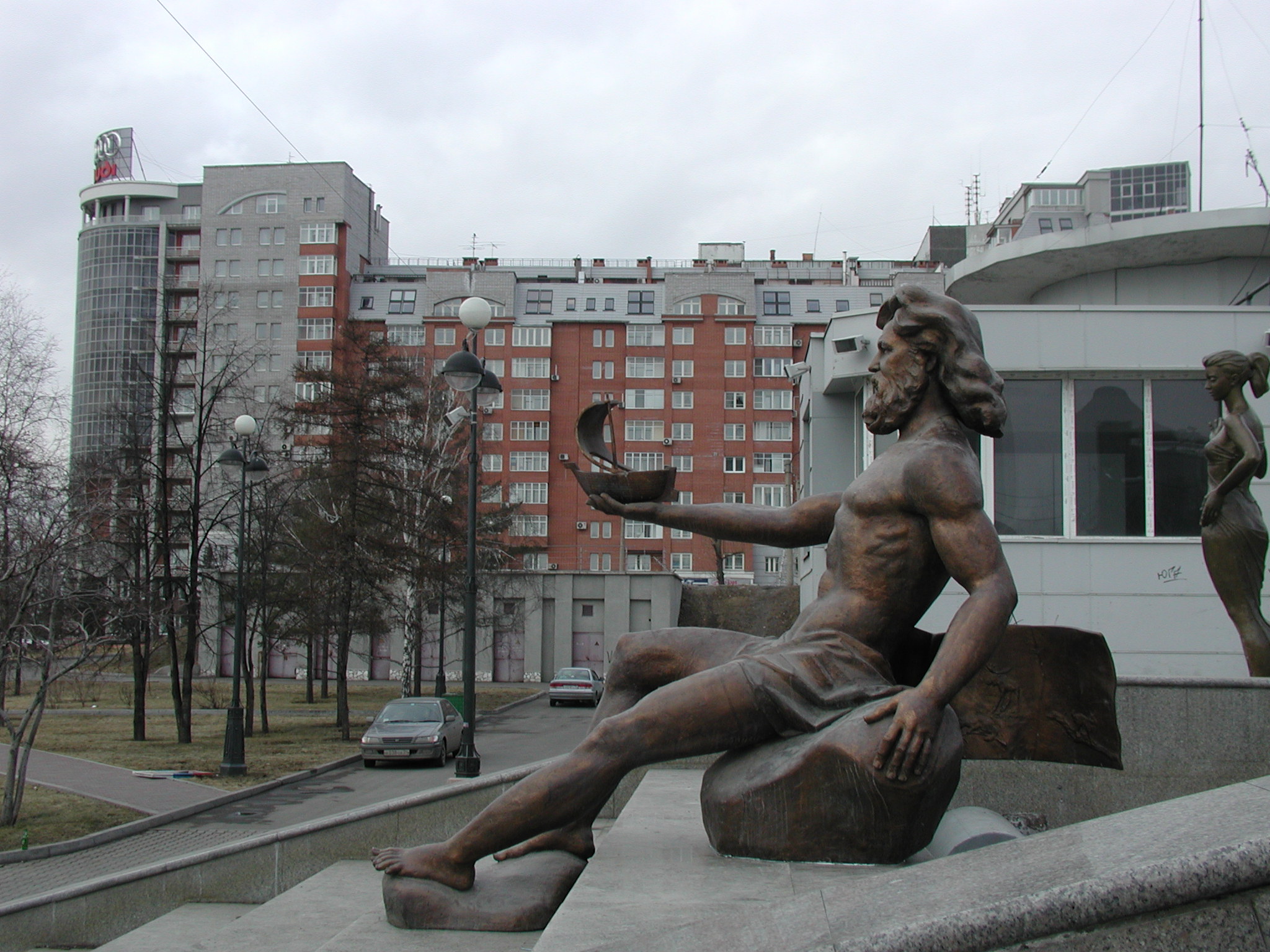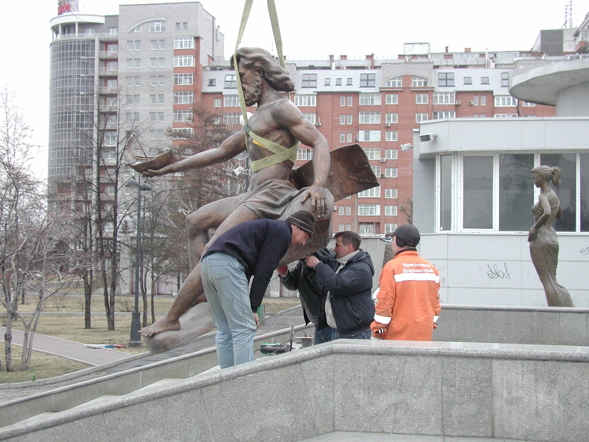 Сегодня фонтан «Реки края» украсила центральная скульптурная композиция – фигура Енисея-батюшки.