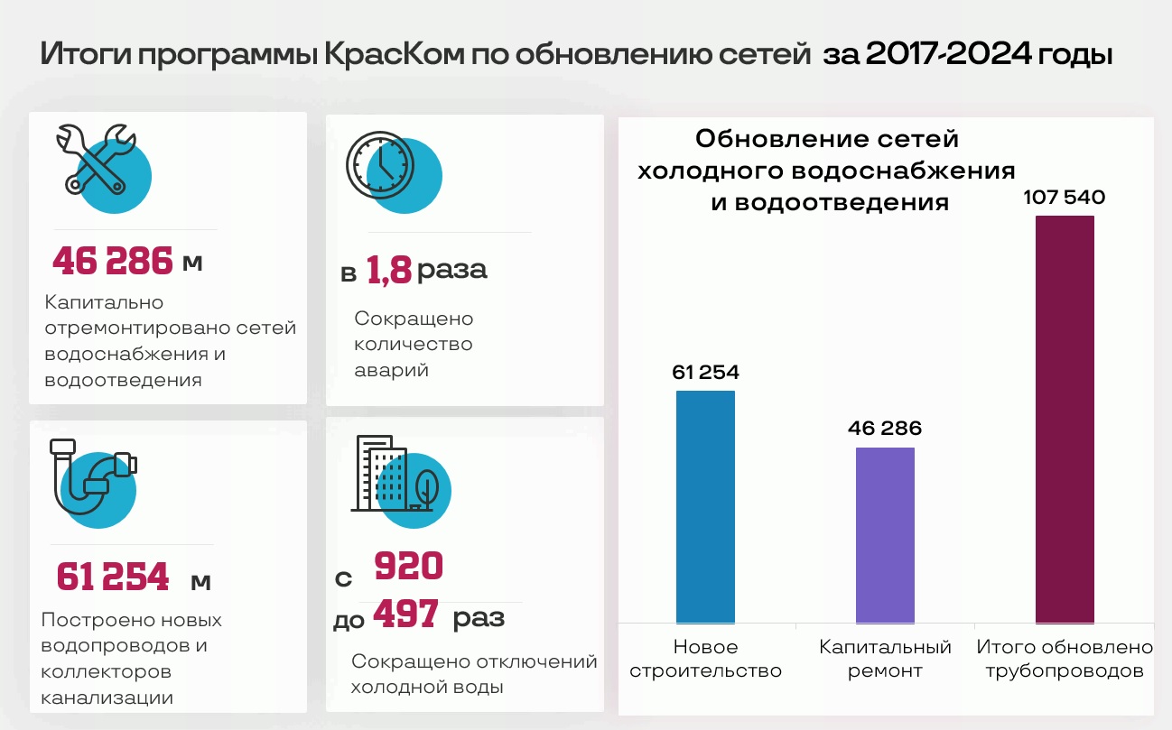 — Мы системно работаем над обновлением коммуникаций системы жизнеобеспечения Красноярска, – рассказывает генеральный директор КрасКом Олег Гончеров. — За последние годы капитально отремонтировали и построили 107,5 км сетей водоснабжения и водоотведения. Это позволило, к примеру, значительно сократить количество отключений холодной воды для устранения повреждений. Если в первый год реализации программы было зарегистрировано 920 отключений, то на сегодняшний день практически в два раза меньше — 497.
