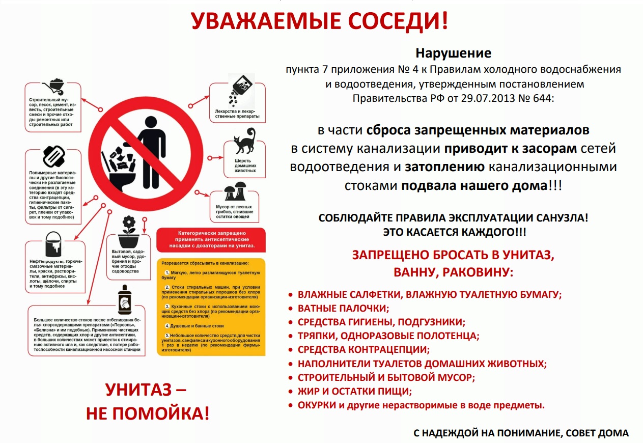 Напоминаем, что в унитаз, раковину и ванну запрещено бросать: