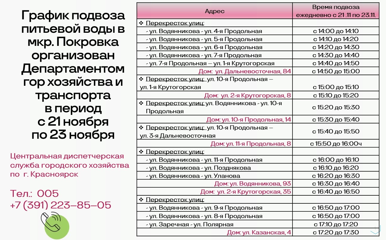 На основании обращения ДГХиТ администрации г. Красноярска с 10:00 часов 21 ноября до 10:00 часов 24 ноября для определения возможного источника подтопления территорий частных домов будет приостановлена подача холодной воды по следующим адресам: