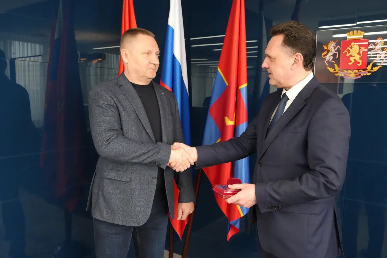 Мэр Красноярска Сергей Верещагин вручил знак «Герб Красноярска» за заслуги перед городом генеральному директору КрасКом Олегу Гончерову