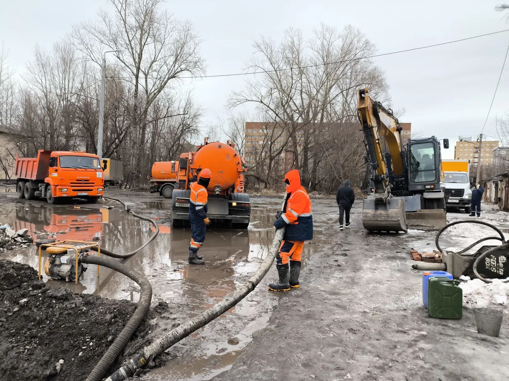 Чтобы добраться до трубопровода, воду откачивают четыре илососа и мотопомпа.
