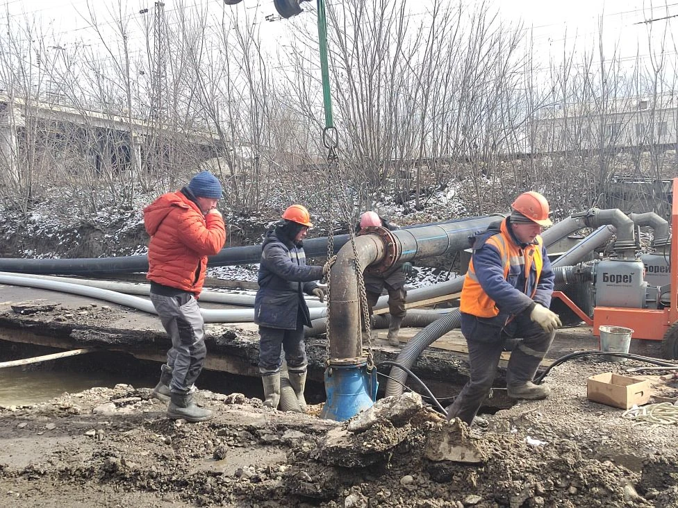 В настоящее время в канализационный коллектор поступает до 2 тысяч кубометров стоков в час. Работы по снижению уровня сточной воды в котловане продолжаются.