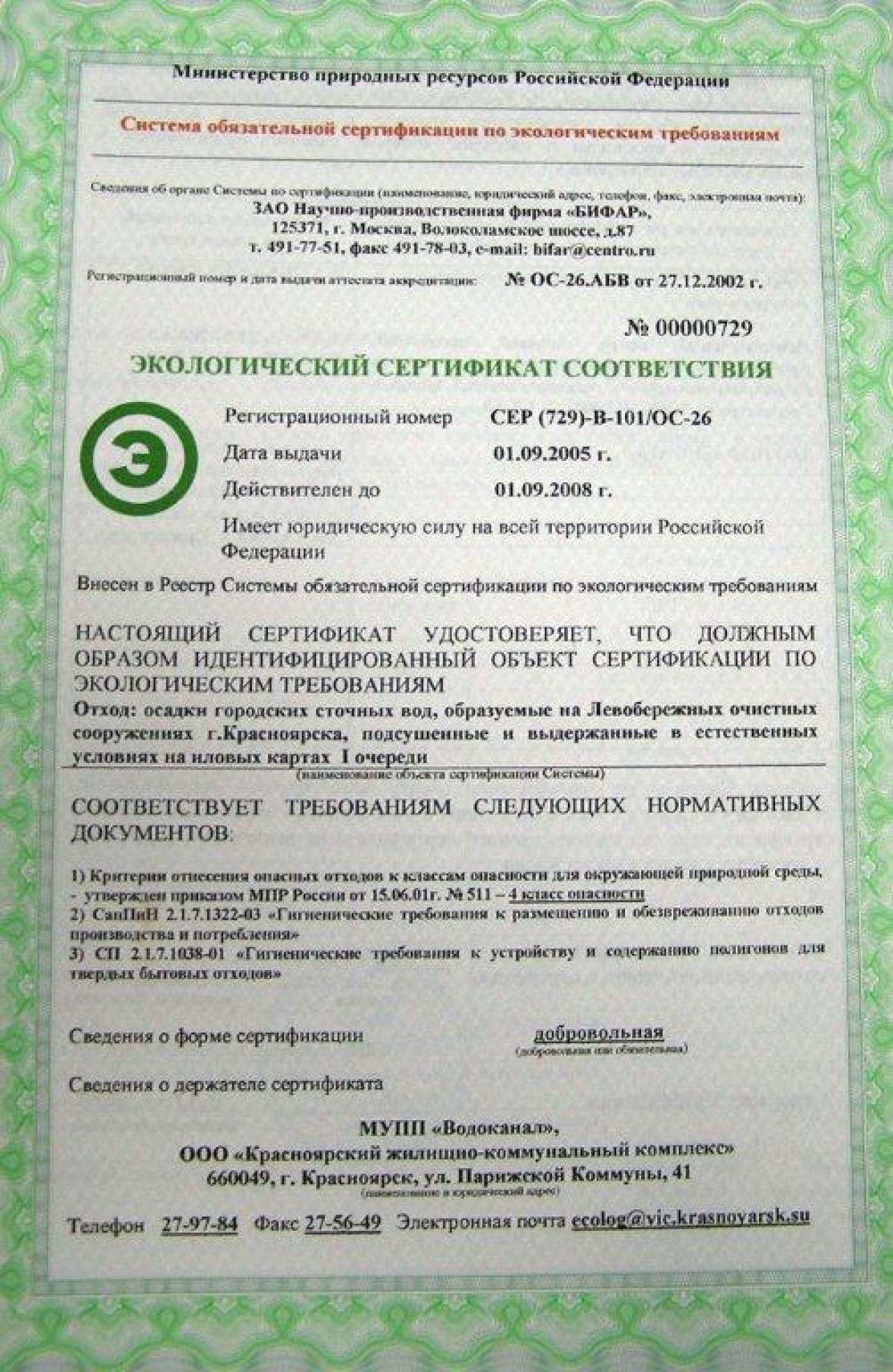 Экологический сертификат соответствия