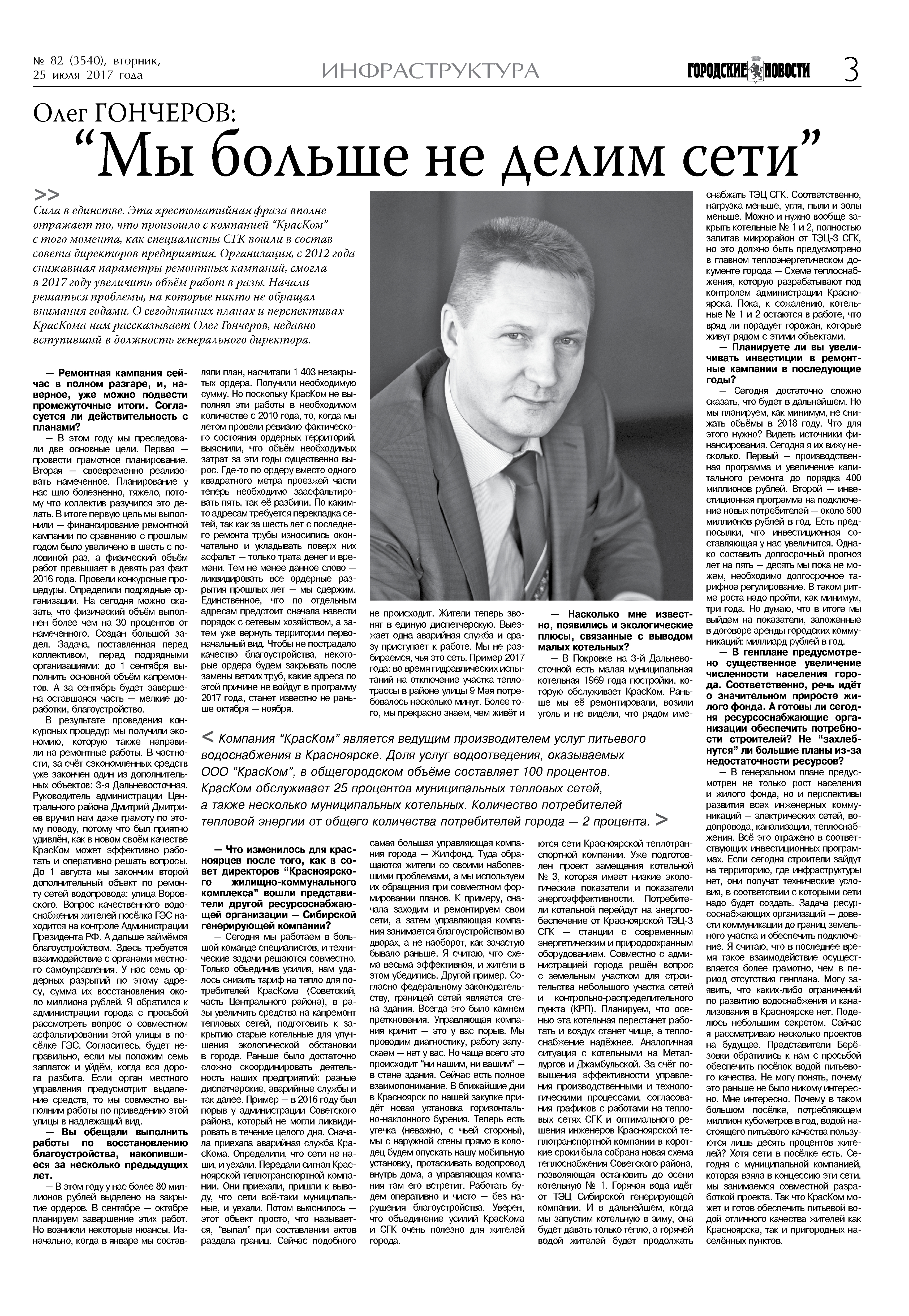 - Сегодня мы работаем в большой команде специалистов, и технические задачи решаются совместно. Только объединив усилия, нам удалось снизить тариф на тепло для потребителей КрасКома (Советский, часть Центрального района), в разы увеличить средства на капремонт тепловых сетей, подготовить к закрытию старые котельные для улучшения экологической обстановки в городе. Раньше было достаточно сложно скоординировать деятельность наших предприятий – разные диспетчерские, разные аварийные службы и т.д. Пример – в 2016 году был порыв у администрации Советского района, который не могли ликвидировать в течение целого дня. Сначала приехала аварийная служба КрасКома. Определили, что сети не наши и уехали. Передали сигнал Красноярской теплотранспортной компании. Они приехали, пришли к выводу, что сети всё-таки муниципальные, и уехали. Потом выяснилось - этот объект просто, что называется, «выпал» при составлении актов раздела границ. Сейчас подобного не происходит. Жители теперь звонят в единую диспетчерскую. Выезжает одна аварийная служба и сразу приступает к работе. Мы не разбираемся, чья это сеть. Пример 2017 года – во время гидравлических испытаний на отключение участка теплотрассы в районе ул. 9 мая потребовалось несколько минут. Более того, мы прекрасно знаем, чем живёт и самая большая управляющая компания города – Жилфонд. Туда обращаются жители со своими наболевшими проблемами, а мы используем их обращения при совместном формировании планов. К примеру, сначала мы заходим и ремонтируем свои сети, а затем управляющая компания занимается благоустройством во дворах, а не наоборот, как зачастую бывало раньше. Я считаю, что схема весьма эффективная и жители в этом убедились. Другой пример. Согласно федеральному законодательству границей сетей является стена здания. Всегда это было камнем преткновения. Управляющая компания кричит – это у вас порыв. Мы проводим диагностику, робота запускаем – нет у вас. Но чаще всего это происходит «ни нашим, ни вашим» – в стене здания. Сейчас есть полное взаимопонимание. В ближайшие дни в Красноярск по нашей закупке придет новая установка горизонтально-наклонного бурения. Теперь есть утечка (неважно с чьей стороны), мы с наружной стены прямо в колодец будем опускать нашу мобильную установку, протаскивать водопровод внутрь дома, а управляющая компания там его встретит. Работать будем оперативно и чисто - без нарушения благоустройства. Уверен, что объединение усилий КрасКома и СГК очень полезно для жителей города.
