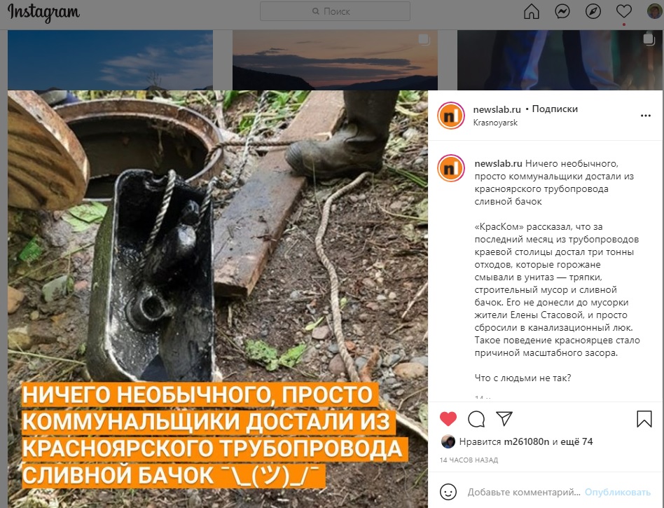 Ничего необычного, просто коммунальщики достали из красноярского трубопровода сливной бачок