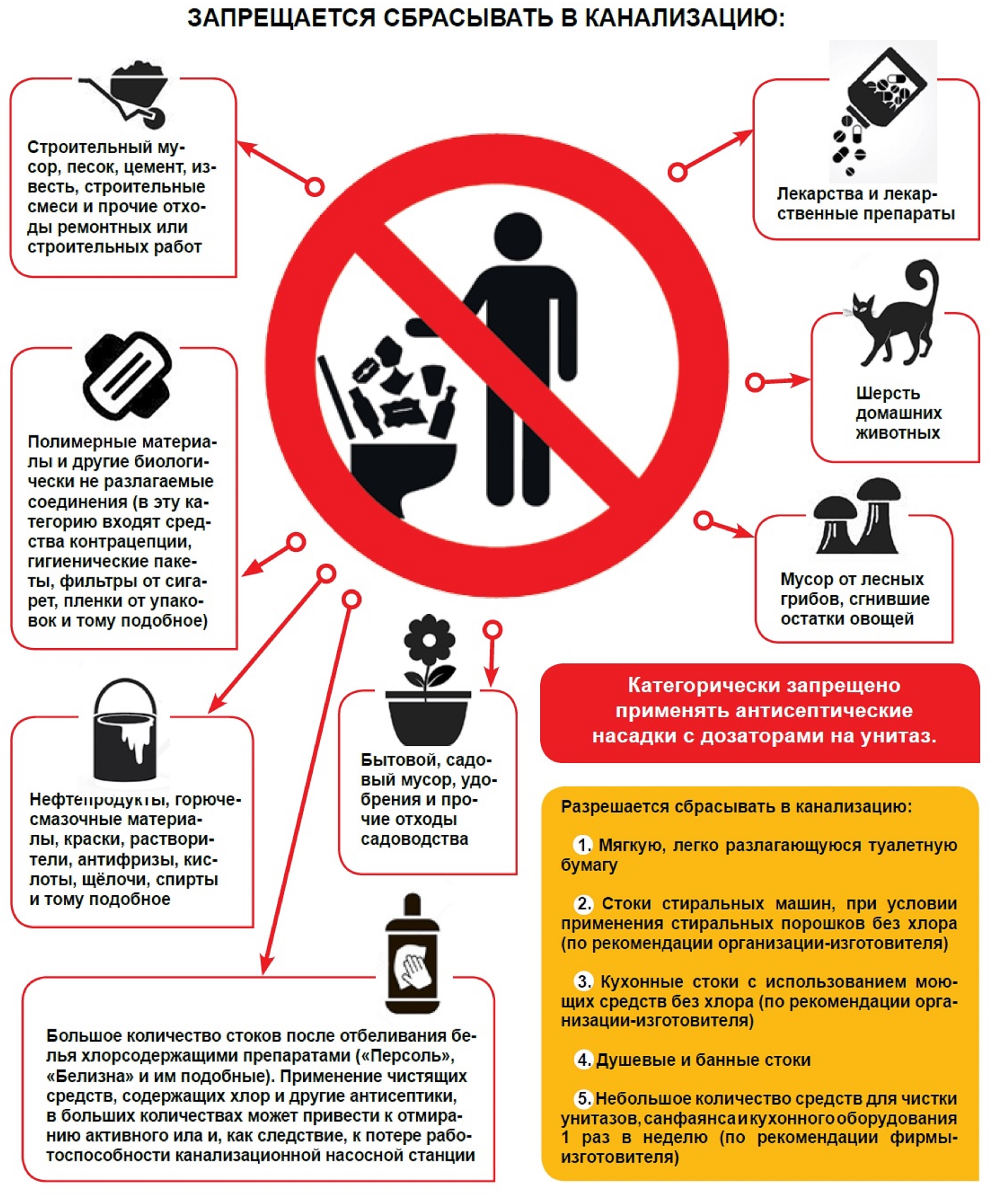 Напомним, что несоблюдение правил эксплуатации санузла грозит авариям на сетях водоотведения, приводит к подтоплению нечистотами подвалов и дворов.