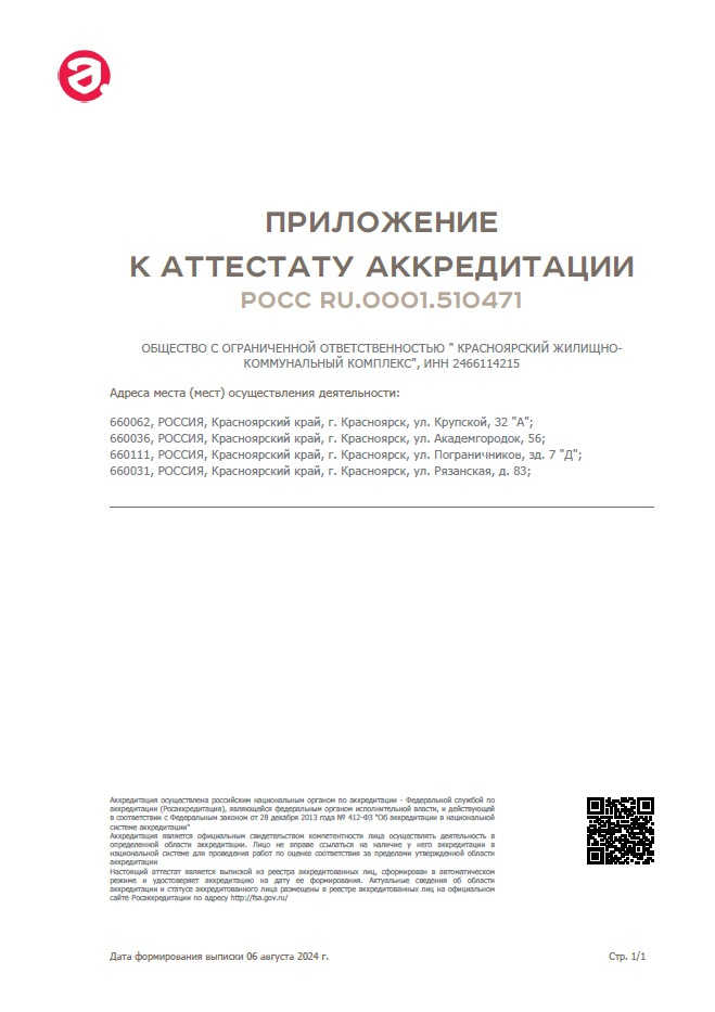 Центр контроля качества воды (ЦККВ) «КрасКом» аккредитован в национальной системе аккредитации на техническую компетентность, номер записи в реестре аккредитованных лиц (аттестат аккредитации) РОСС RU. 0001.510471, имеет лицензию на деятельность в области использования возбудителей инфекционных заболеваний человека и животных и генно-инженерно-модифицированных организмов III и IV степени потенциальной опасности (лицензия).
