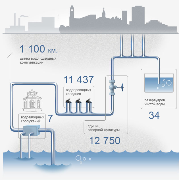 - водозаборных сооружений — 7 ед. проектной мощностью 810 тыс. м³/сутки;